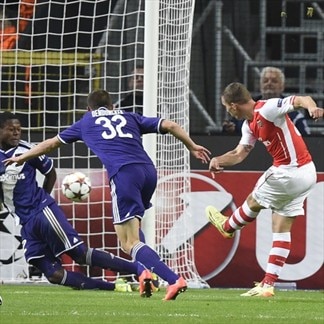 Kieran Gibbs (89') and Lukas Podolski (90'+1, shown here) delivered the goals in the final minutes as Arsenal came from behind to upend RSC Anderlecht 2-1 on the road.