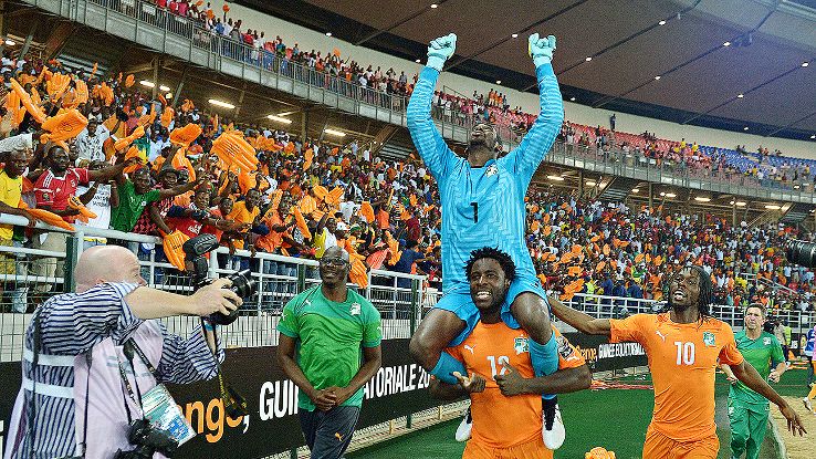 After 120 scoreless minutes on Sunday, Ivory Coast claimed their first African Nations Cup since 1992 by winning the penalty-kick shootout 9-8 over Ghana. In what proved to be the eleventh and final round of the shootout, Elephants goalkeeper Boubacar Barry (that's him being carried by an equally happy teammate) saved his Black Stars counterpart Brimah Razak's PK, then beat his opposite number on his own spot kick to lock up the victory for the Ivorians and a berth in the 2017 FIFA Confederations Cup, due to be played in Russia.