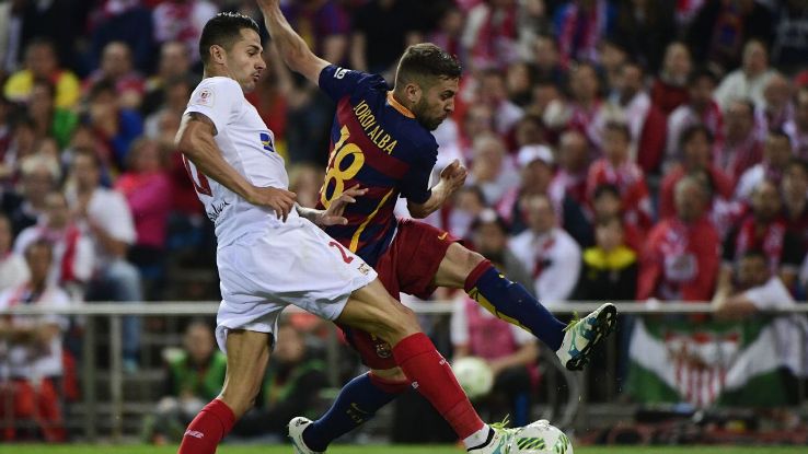 Despite losing Javier Mascherano to a red-card ejection in the 36th minute, Barcelona, with goals in overtime from Jordi Alba (97', shown here) and Neymar (120'+2) defeated Sevilla (who finished the match with nine men) 2-0 to capture their record 28th Copa del Rey title on Sunday.