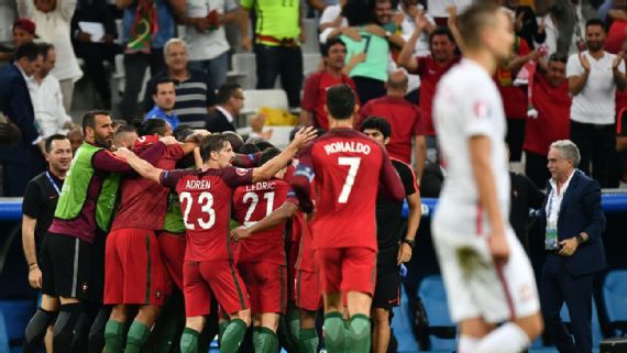 In the lone Thursday quarterfinal-round contest in the European Championship, after a 1-1 draw at the regulation, which was followed by thirty scoreless overtime minutes, Cristiano Ronaldo, Renato Sanches (who scored in the 33rd minute of regulation, which was by this celebration pictured above), Joao Moutinho, Nani, and Ricardo Quaresma all converted their spot kicks as Portugal defeated Poland 5-3 in the penalty-kick shootout. Portuguese goalkeeper Rui Patricio made the big save of the shootout as he saved Jakub Blaszczykowski's spot kick.
