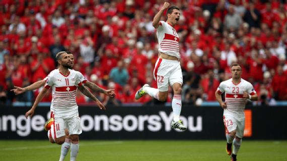 Fabian Schar scored the only goal of the match in the fifth minute as Switzerland spoiled Albania's major-tournament debut with a 1-0 victory over their ten-man opponents. That's Fabian here, celebrating what proved to be his game winner.