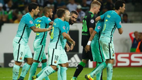 Arda Turan (65', that him celebrating with teammates after scoring) and Gerard Pique (74') each scored once as Barcelona came from behind to overtake Borussia Monchengladbach 2-1 on the road.