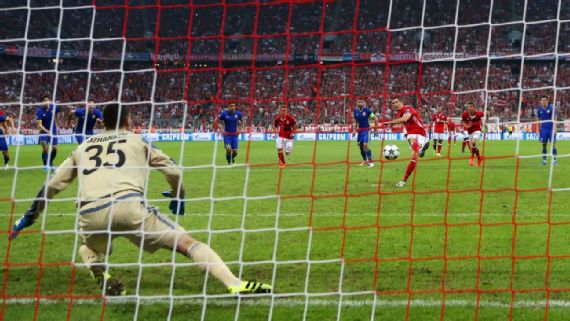 Joshua Kimmich scored twice (53', 60') as Bayern Munich destroyed visiting FC Rostov 5-0. Here, we see Bayern's Robert Lewandowski converting a penalty kick in the 28th minute.