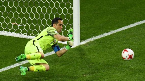 After 120 scoreless minutes on Wednesday, Arturo Vidal, Charles Aranguiz, and Alexis Sanchez all converted their spot kicks while goalkeeper Claudio Bravo (shown here) saved all three PKs from Portugal as Chile won the penalty-kick shootout 3-0 to advance to Sunday FIFA Confederations Cup Final against the winner of Thursday's Germany-Mexico contest.