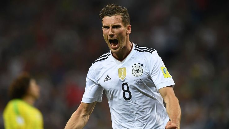 At Sochi, Russia: In Thursday's FIFA Confederations Cup semifinal contest, Leon Goretzka scored twice (6', 8'; that's him celebrating here) as Germany overpowered Mexico 4-1 to advance to Sunday's final against Chile. Photo from ESPN FC website